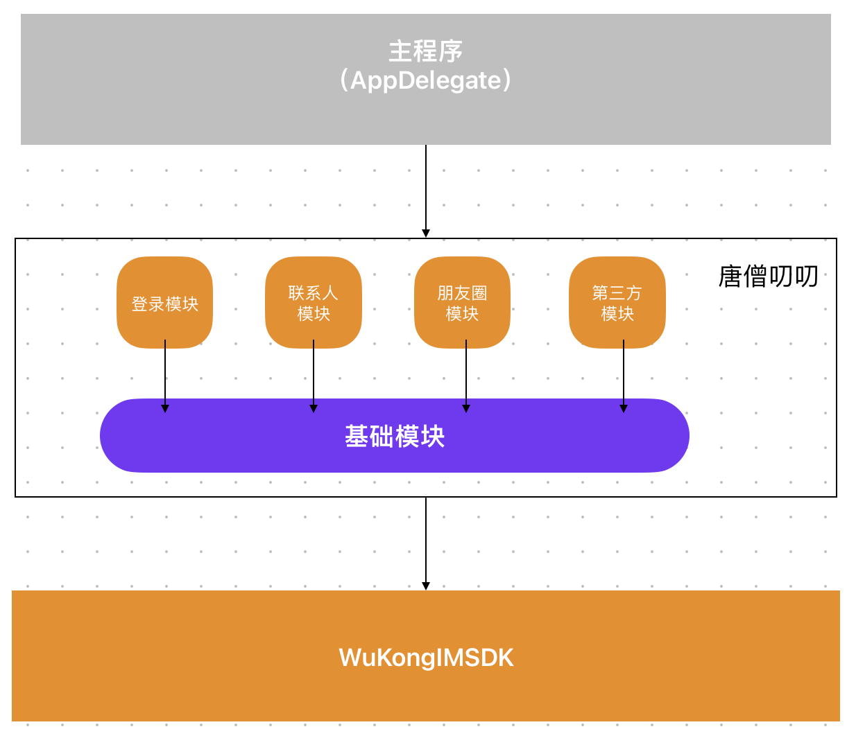 唐僧叨叨iOS采用模块化开发,每个模块都是一个独立的pod,可以单独使用,也可以组合使用。设计达到的目的就是在Podfile一句配置就能引入模块 例如 pod 'WuKongLogin', :path => './Modules/WuKongLogin' ## 登录模块 无需在做其他修改。